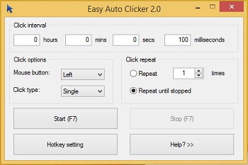 A free auto clicker which will easy to solve all your clicking needs, do you need a head start at a game? Well choose between right and left mouse clicks and even choose the time delay between each click all on one small simple application.